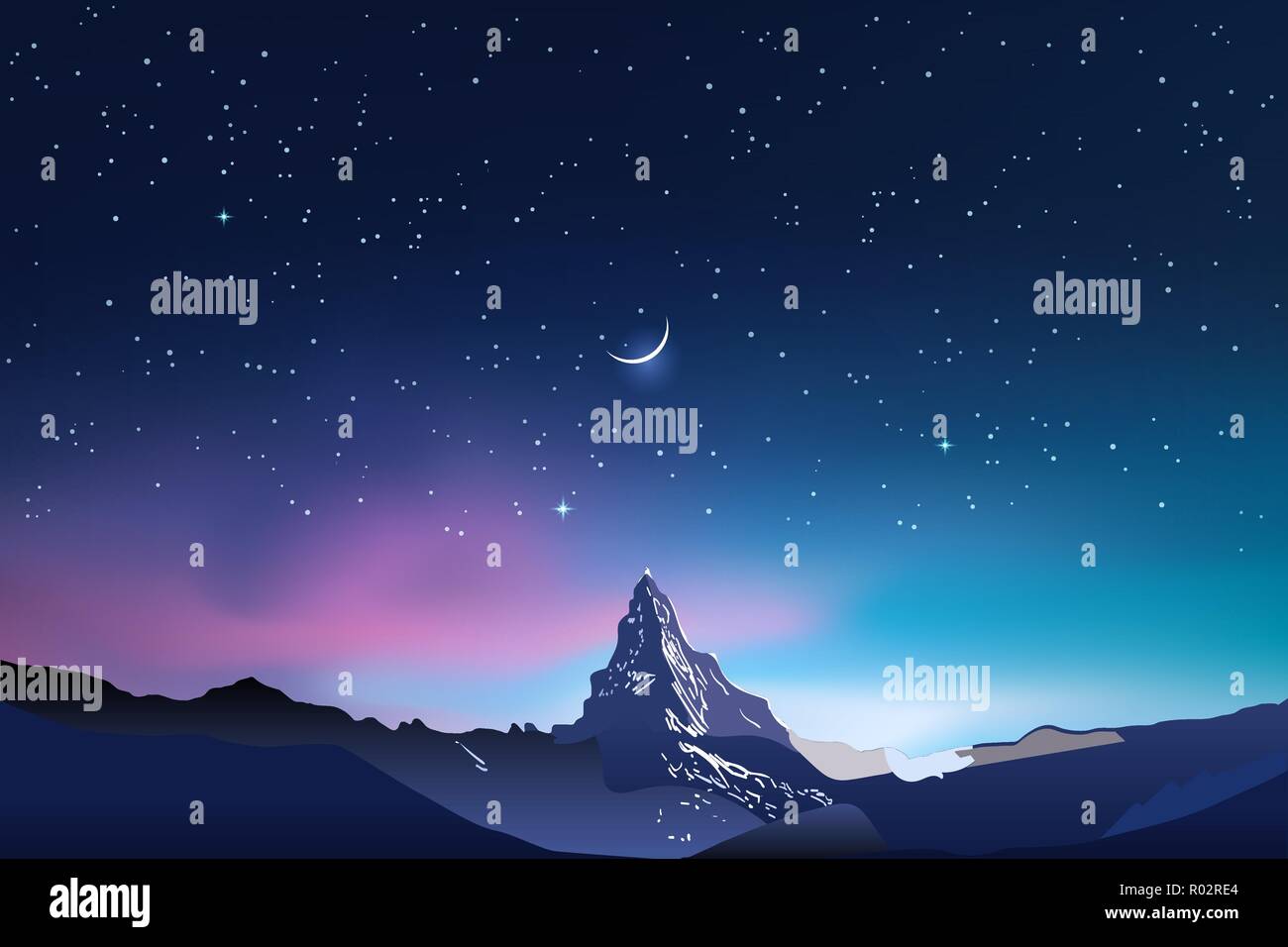 Snowy mountains silhouettes, pink and blue night sky landscape with stars, starry sky, half moon, crescent, vector illustration